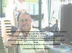 Les archers Ansois ont l'immense tristesse de vous faire part du décès de leur ami Paul Delayat. Archer depuis les débuts du club, il a toujours su animer et faire partager son plaisir à la pratique de ce sport. Sa bonne humeur et sa convivialité restera à tout jamais gravée en nous. Ses obsèques auront lieu ce jeudi à 10h en l'église d'Anse. Compagnie des Archers Ansois